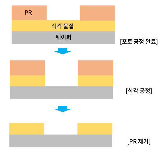 식각공정이란, 박막의 전부 혹은 포토공정에서 정의(현상)된 일부를 물리 혹은 화학적인 방법으로 제거하는 공정으로, 주로 반응성이 강한 할로겐 계열 물질을 사용하여 진행한다. 식각공정은 포토공정과도 바로 연결되어 진행되는 작업이기 때문에 전에 올렸던 포토 공정의 내용을 떠올려보자.