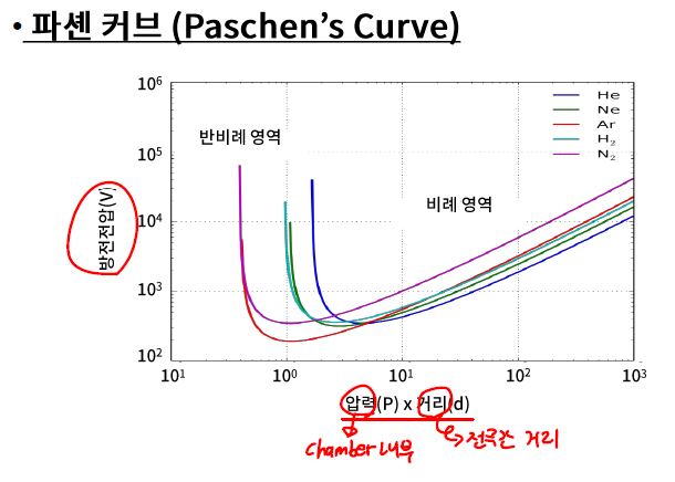 Low PXd : 압력이 낮아, 기체 분자수가 적고 그로 인해 MFP(Mean-Freepath)가 증가하면서 Gas 분자와 충돌이 없이 지나가기 때문에 방전 전압이 증가한다.